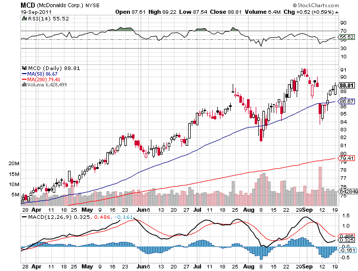MCD- McDonalds is performing real well in a bad tape up .59% at the close. MCD is a classic defensive play in this environment and I am looking to add it to my portfolio. It has a nice 2.8% dividend yield as well. Problems include exposure to Europe, but they have nice growth in Asia and people like their cheap eats in this economic environment. Their chart looks pretty as well.